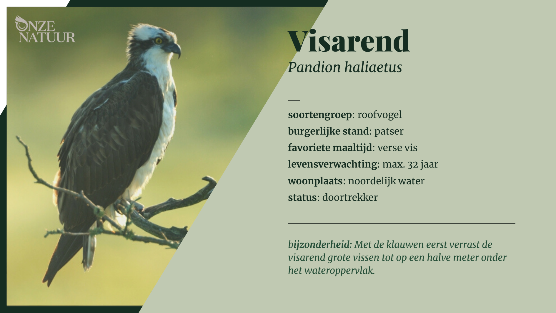 De Europese visarend (Pandion haliaetus) is een indrukwekkende roofvogel die bijna volledig is gespecialiseerd in het vangen van vis. Hij staat bekend om zijn spectaculaire duikvluchten en zijn sterke band met meren, rivieren en kustgebieden.