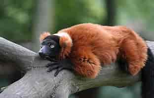 De Rode Vari heeft grote, heldere ogen en een lange, wollige staart die helpt bij balans in de bomen.
